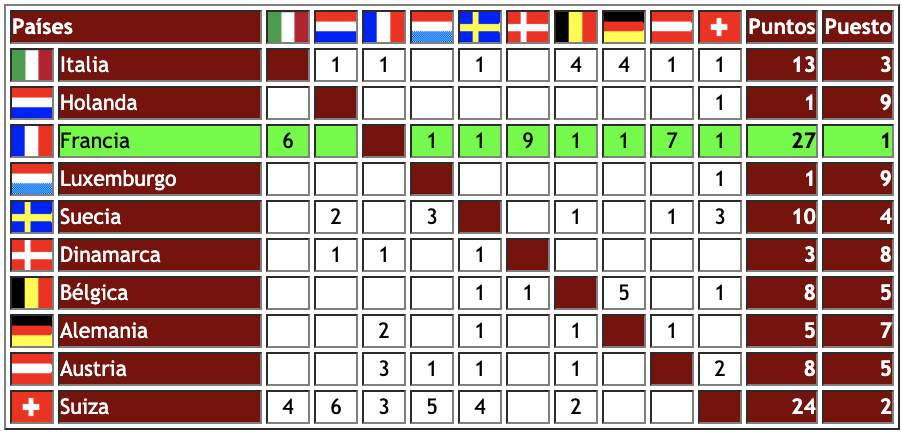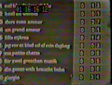 - Holanda y Luxemburgo. Empate en el último puesto a un punto. Por un lado, la laureada holandesa Corry Brokken con Heel de wereld (El mundo entero), ganadora del año anterior (y cuya próxima aparición en Eurovisión será dieciocho años después y como presentadora). Por otro, la representante de Luxemburgo, Solange Berry, con la canción Un grand amour (Un gran amor).