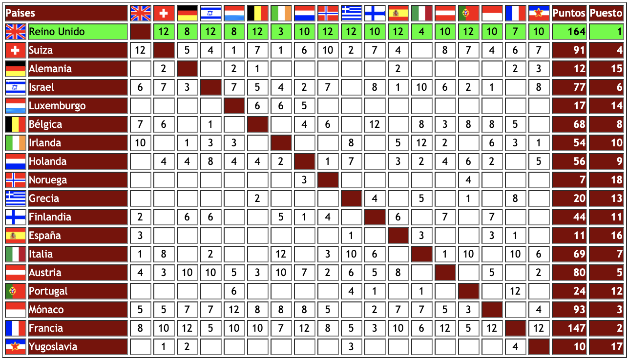 - España. El canario Braulio casi consiguió que sobrara su Sobran las palabras: con once míseros puntitos (tres 3 de Reino Unido, Italia y Mónaco y dos 1s de Grecia y Francia) obtuvo el puesto más bajo de las clasificaciones españolas hasta la fecha.