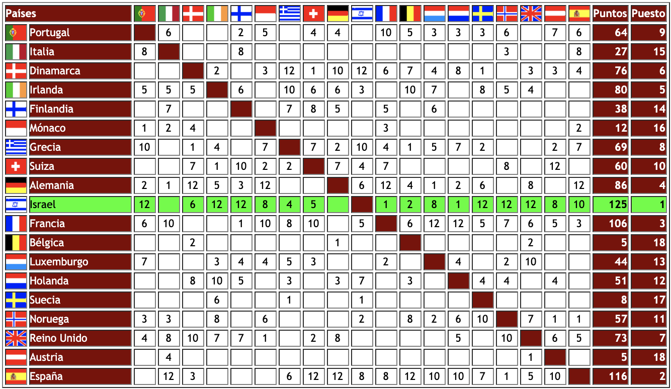– Ninguna canción fue votada por todos los jurados. Israel tuvo puntos de 16, Francia de 15, y Dinamarca, Grecia, Alemania y España de 14. Nadie quedó con cero. Austria sólo tuvo puntos de 2 jurados. Bélgica y Suecia, de 3.