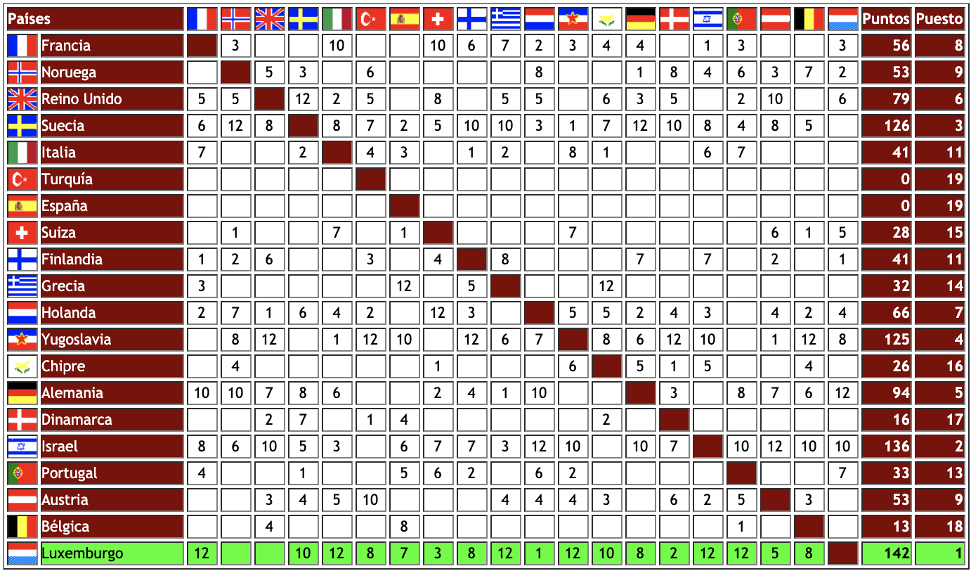 - Luxemburgo. Cerró la gala una joven parisina de 21 años, Corinne Hermes, con la canción Si la vie est cadeau (Si la vida es regalo), una potente balada sobre la efímera felicidad, la ruptura amorosa y la invitación a disfrutar la vida. Un texto optimista, pese a referirse al fracaso, y una hermosa melodía. Con 142 puntos, superaba en seis a la canción israelí y se aupaba al primer puesto.
