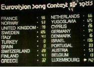 - Grecia. Tras la ausencia de 1982 vuelve con Christie (Christie Stassinopoulou), que había quedado segunda en la final nacional de 1979 (Dose mou enan sticho). Lo hace con Mou les (Me hablas), un tema de amor con un poético texto en el que se evoca la figura del amado viajero (mares, barcos, trenes) y el deseo de apresarlo, una balada a la que se trató de dotar de un fuerte soporte instrumental, no sólo con los músicos en escena sino con los de la orquesta (con un solo de arpa al comienzo y otro de violines en medio). Quedó en el puesto 14º con 32 puntos y 2 doces (España y Chipre). Marianna Efstratiou, representante griega de 1989 y 1996, ha puesto su voz a una versión de Mou les. Christie la versionó al inglés (Tell me).