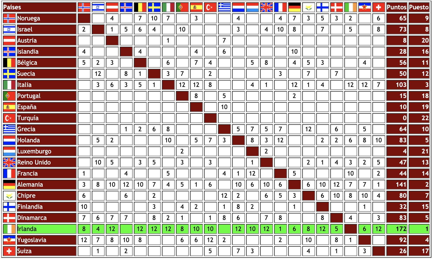 - Austria. Junto a Udo Jürgens, Gary Lux es el eurovisivo austríaco que más veces ha pisado el escenario del Festival; si Udo gana por resultados, Gary lo hace por ocasiones en que formó parte de la delegación de su país. Nur noch Gefühl (Sólo sentimiento) es una balada en la que Lux le canta a su amada que «sólo la emoción existe» entre ellos. Clasificación: 20º con 8 puntos.