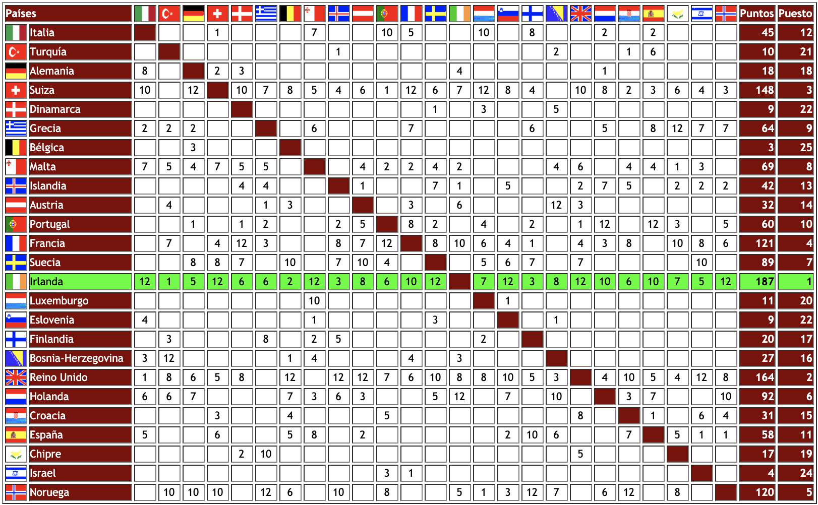 - Irlanda. La final nacional, de ocho canciones y votación de diez jurados regionales, dio vencedora a Niamh Kavanagh con la canción In your eyes (En tus ojos), una balada clásica que exalta la fuerza del amor. Fue premiada con la cifra récord de 187 puntos y la victoria. In your eyes se convirtió en el disco más vendido en Irlanda a lo largo de 1993.
