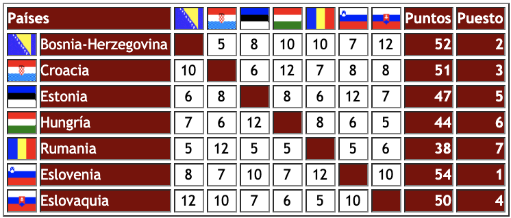 - Eslovenia. En la primera edición del Slovenski izbor za pesem compitieron doce canciones y los votos de 12 jurados regionales decidieron que el grupo 1xBand (Cole Moretti, Tomaž Kosec, Andrej Bedjanič, Brane Vidan, Sandra Zupanc y Barbara Šinigoj) llegara al festival con Tih deževen dan (Un día tranquilo de lluvia), un texto bastante serio con ribetes filosóficos sobre la incosistencia de la vida y la importancia de los sueños que adquirió un tono muy desenfadado con la interpretación casi cómica de la banda eslovena. Con 9 puntos empataron en la 22ª posición con Dinamarca.