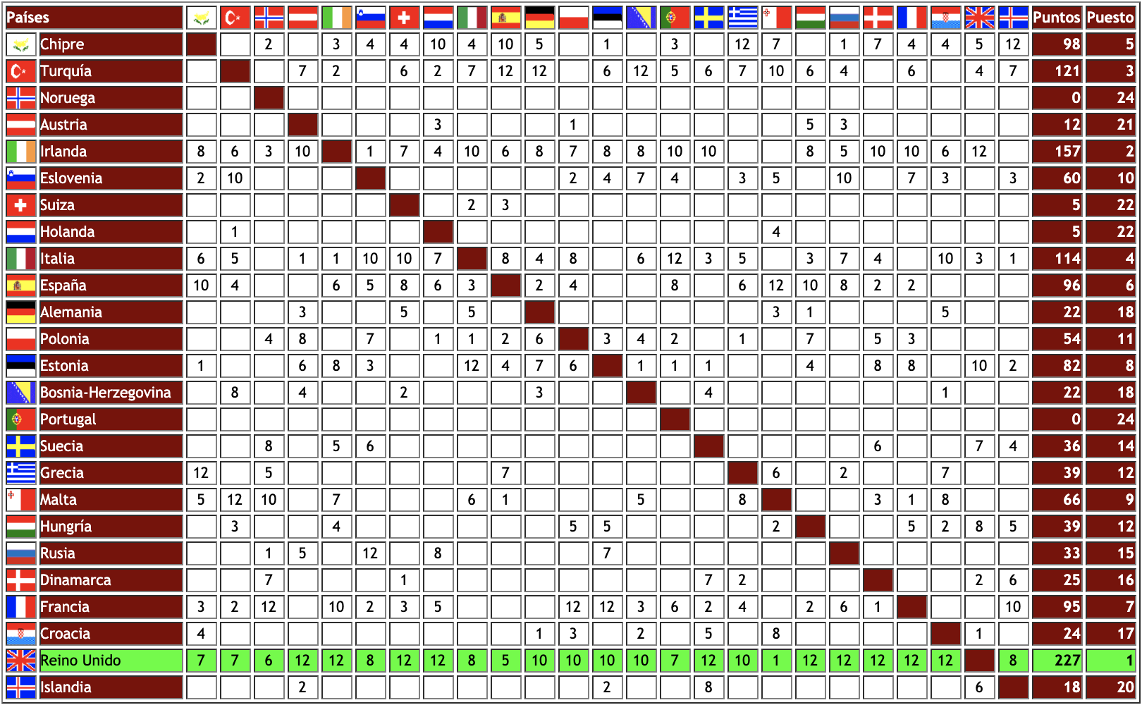 - Reino Unido. El triunfo fue para Katrina and The Waves (Alex Cooper, Vince de la Cruz, Kimberley Rew y la propia Katrina Leskanich), quienes ya habían cosechado un gran éxito con Walking on sunshine en 1985. La canción ganadora fue Love shine a light (Amor, enciende una luz), una canción efectista sobre la universalidad del amor, con un ritmo pegadizo y envolvente, escrita y compuesta por uno de los miembros de la banda, Kimberley Rew, que no estuvo en escena. Recibió 227 puntos de todos los jurados y televotos, obteniendo un record de máximas puntuaciones, nada menos que 10 doces (cifra que no será superada hasta 2005).