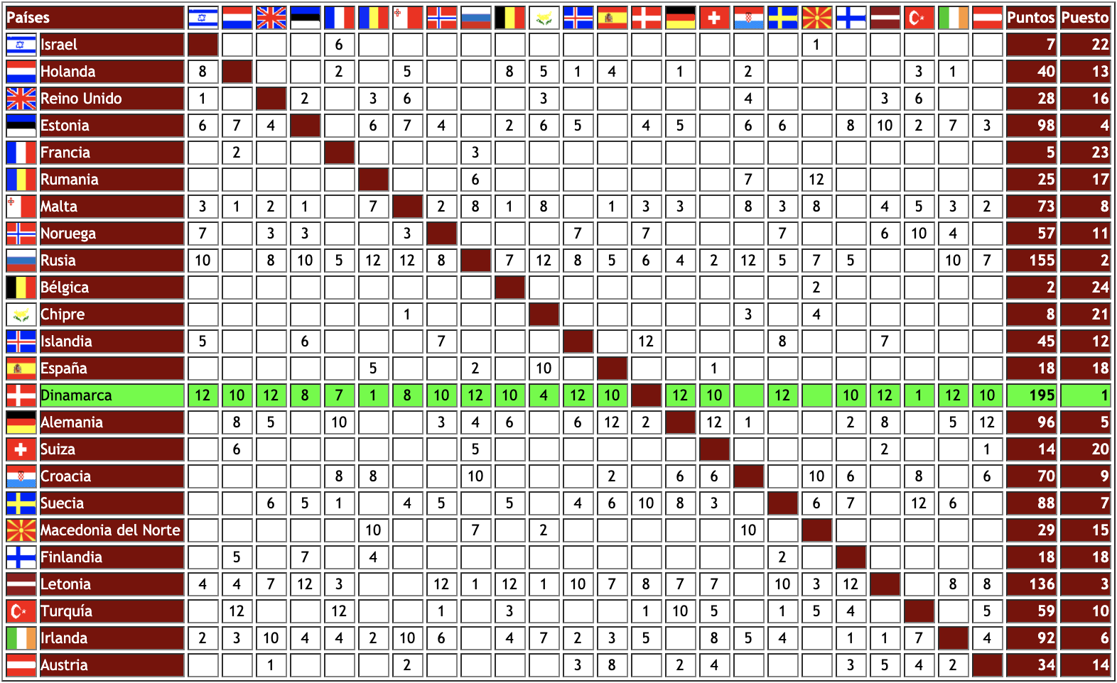 - Dinamarca. Los hermanos Olsen (Jørgen y Noller) eran los ganadores de la final nacional con el tema en danés Smuk som et stjerneskud, que para Eurovisión llevaron en inglés como Fly on the wings of love (Vuela en las alas del amor), una canción pop romántica en la que los cantantes declaran su amor a una mujer en etapa de madurez. 195 puntos les llevaron hasta la victoria. La canción ha sido versionada por distintos grupos de música eurodance como el español XTM y DJ Chuckie.