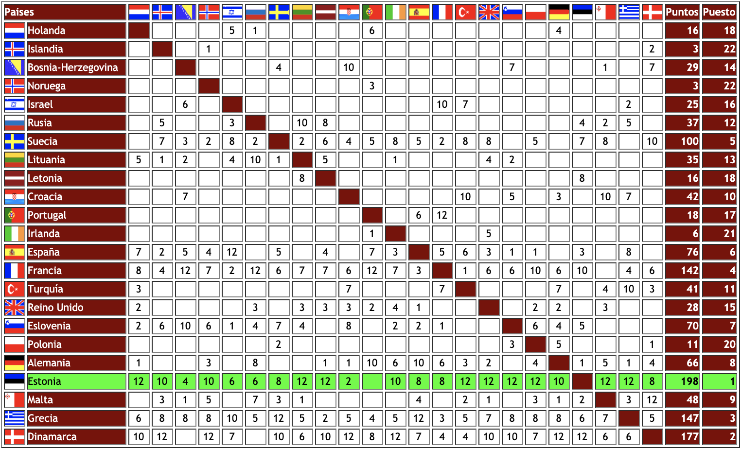 - Estonia. Tanel Padar y Dave Benton, apoyados vocalmente por el grupo 2XL (Lauri Pihlap, Kaido Põldma, Sergei Morgun e Indrek Soom) interpretaron Everybody, un tema pop que se convierte en una invitación a la fiesta, con el dúo cantando que «cada noche es una noche de viernes». 198 puntos les catapultaron hasta la victoria.