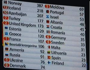 | – Islandia ganó la 1ª semifinal en un resultado ajustado con Turquía. Bosnia-Herzegovina, más lejos, quedó en tercer lugar. En el lado opuesto, la República Checa fue el bottom de la semifinal con 0 puntos. Bélgica se salvó del rosco gracias a un único punto de Armenia. – Se clasificaron para la final las nueve canciones más votadas por el televoto. El 10º clasificado lo «repescó» el jurado profesional de reserva. Así, Finlandia se clasificó para la final en detrimento de FYR Macedonia (situación que ya le ocurrió también en 2008). – Todos los países utilizaron el televoto y los mensajes a móviles (SMS) para otorgar sus puntuaciones. |