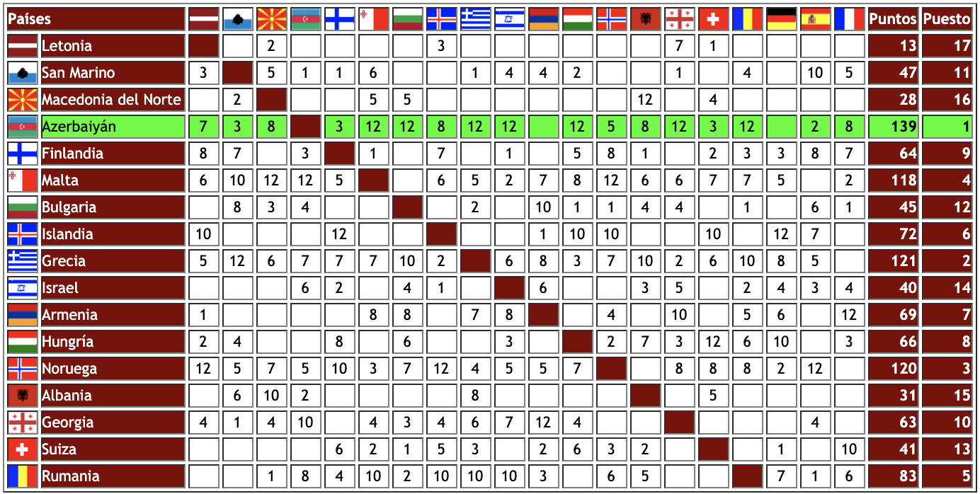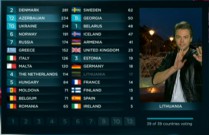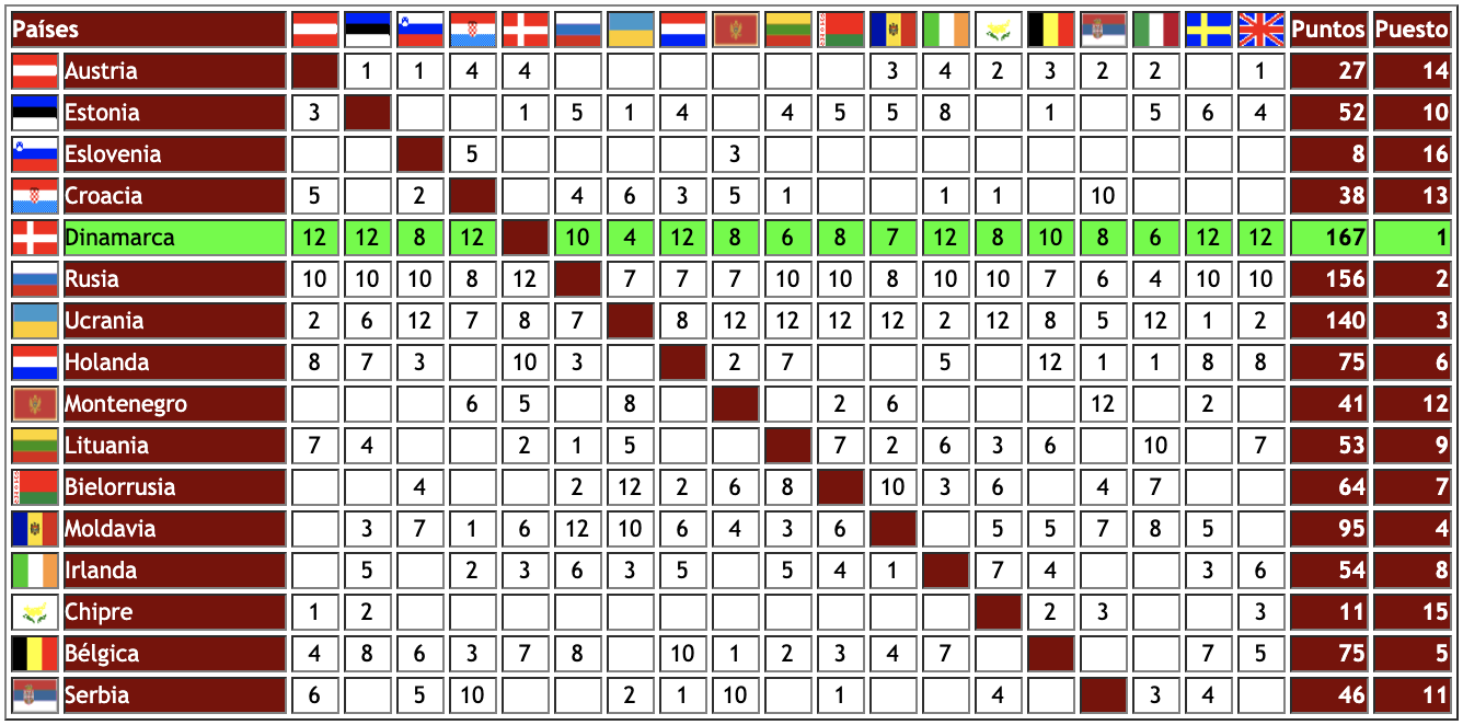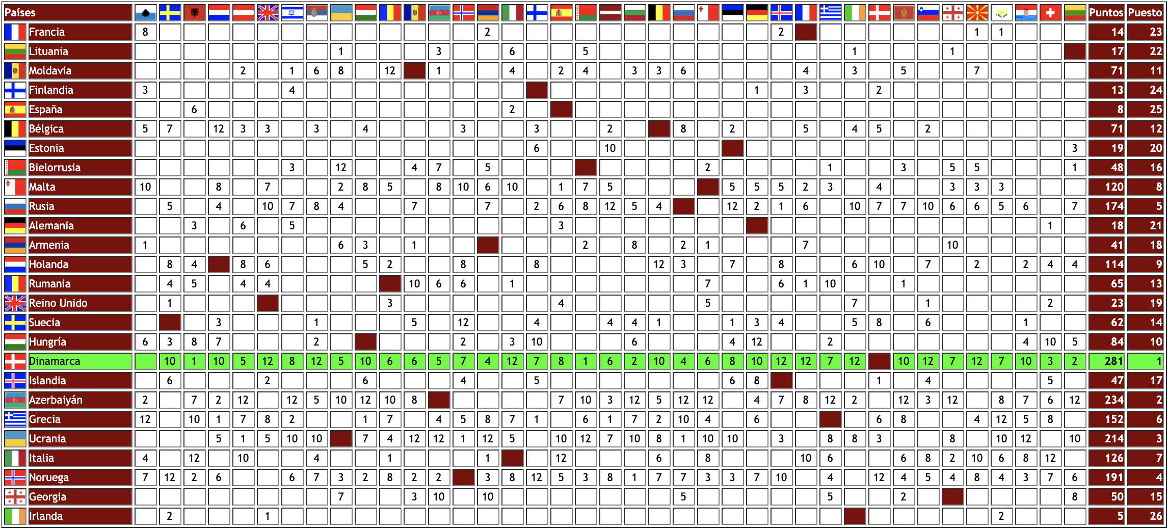 – Dinamarca se alzó con la victoria en tierras suecas, igual que sucedió en 2.000. Emmelie sumó 281 puntos y ocho doces. Sólo el jurado de San Marino dejó sin ningún punto a la ganadora. La «plata» fue para Azerbaiyán, que obtuvo 234 puntos y diez máximas puntuaciones. Completó el podio Ucrania con 214 puntos y cinco doces. – La victoria danesa no se fraguó precisamente de la mano de los países nórdicos, que se decantaron ligeramente por Noruega. Entre estos países sólo Islandia le dio el 12 a Dinamarca, pues Suecia y Finlandia (además de la propia Dinamarca) se lo dieron a Noruega y ésta a Suecia. – Los 6 puntos del jurado de Albania y el 2 de Italia libraron a España del bottom, que se fue a Irlanda, y del temible «null points» al final de la noche. – La votación en la final se reparte al 50% entre el televoto y un jurado compuesto por cinco miembros pertenecientes a la industria de la música que basan sus puntos en función del segundo ensayo de vestuario (el día previo a la final) junto a un auditor externo. Por primera vez, tanto el jurado como el televoto ya no hacen su top10, sino un top completo con todas las canciones. Los rankings de jurado y televoto se suman, y de ahí se obtienen finalmente los puntos de 12 a 1. Si la suma de jurado y público es igual, se le otorgan más puntos al país mejor colocado en la votación del público. – Todos los países utilizaron el método 50% jurado/50% televoto, excepto San Marino y Albania. |