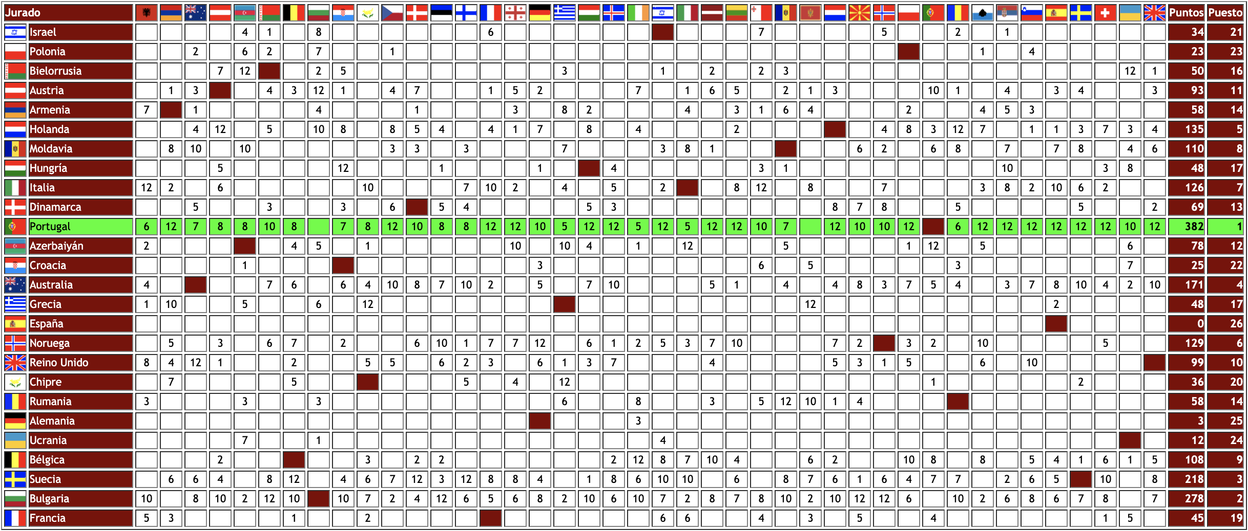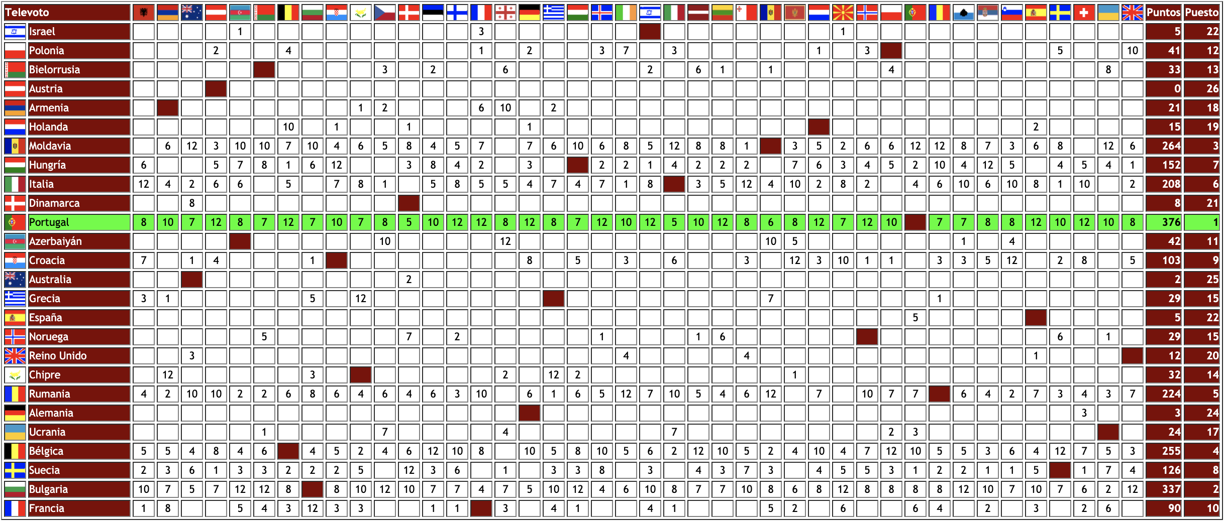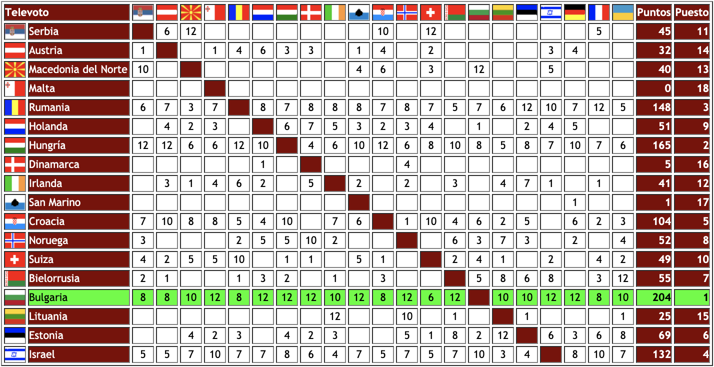 – Rumania, en el caso contrario, quedó 3ª en el televoto, pero los jurados la dejaron en 15ª posición.