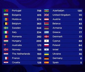 – Portugal, en su 49ª participación, logró su primera victoria en 2017. Eso sí, lo hizo con récord de puntuación: Salvador Sobral sumó 758 puntos con «Amar pelos dois». Logró la victoria tanto del televoto (39 puntos más que Bulgaria), como del jurado (104 puntos más que Bulgaria).